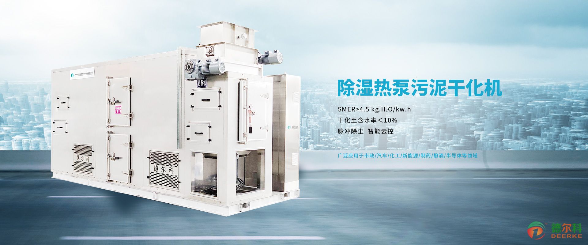 德爾科自主創新研發設計制造的污泥干化機,利用制冷系統的低溫熱泵除濕原理,將來自干燥室的濕空氣降溫脫濕,同時回收水分凝結的潛熱再次加熱干燥空氣,對網帶上的濕污泥進行脫水干化。設備全密閉式新穎設計,箱體內干燥熱風無熱損,干燥過程中實現能量的循環利用,實現